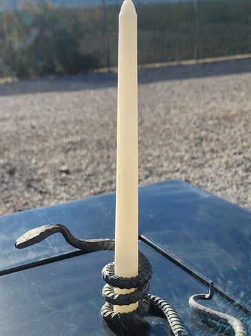 Iron metal coiled 3 times wiht 1" hole diameter for candle. The head and tail extended. Click image for more info.